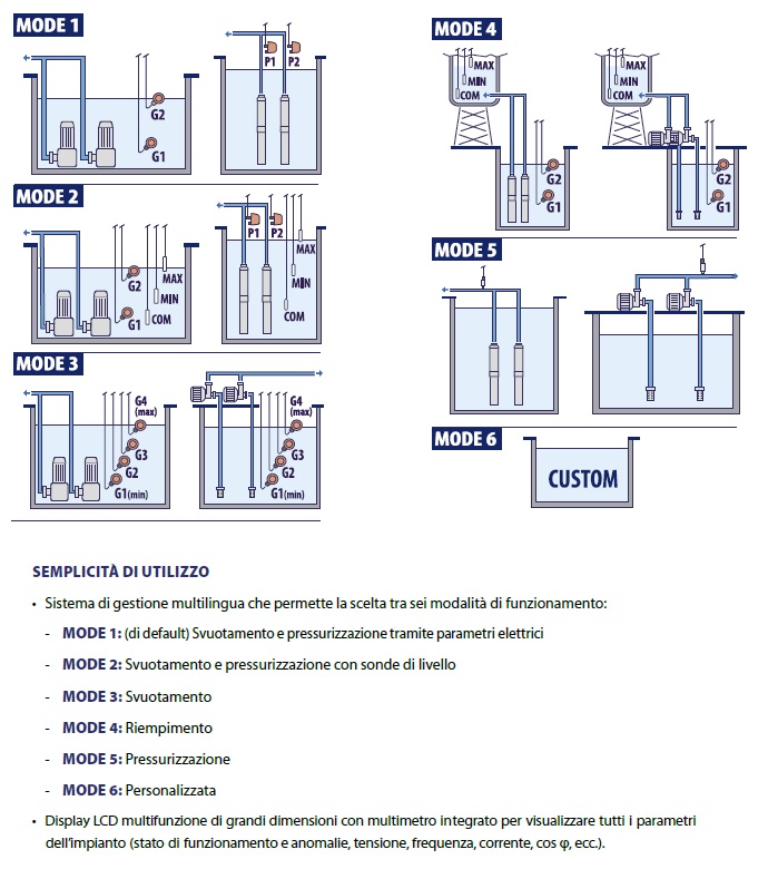 - Grazie alla possibilità di selezionare 6 tipologie di funzionamento, permette di gestire in modo semplice ed intuitivo ogni impianto di pompaggio.